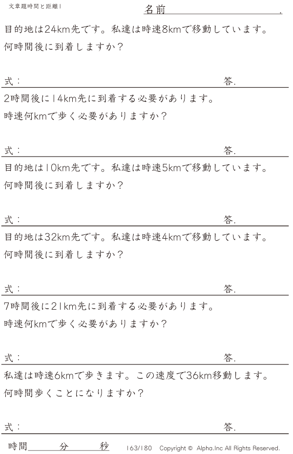 時間と距離の文章題1:時速8kmまで [問題]163/180