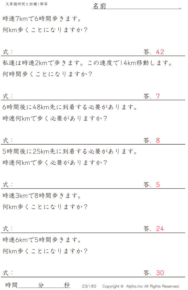 時間と距離の文章題1:時速8kmまで [解答]023/180