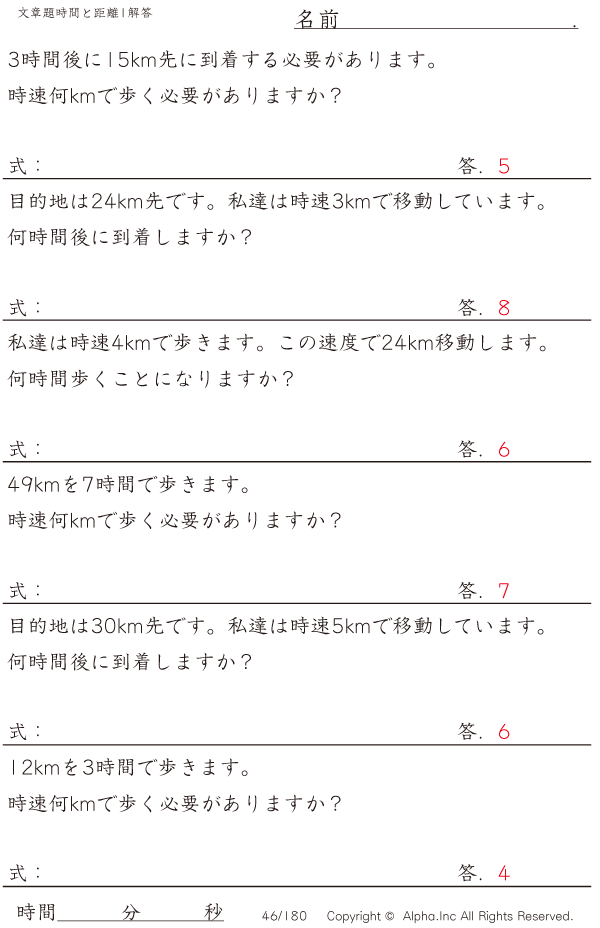 時間と距離の文章題1:時速8kmまで [解答]046/180