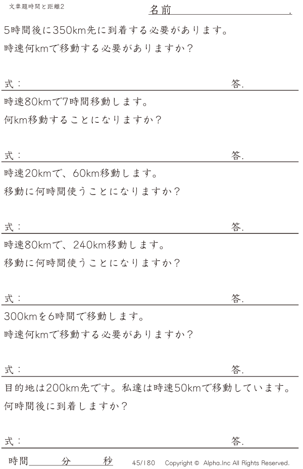 上記のボタンから「時間と距離の文章題2:時速80kmまで・10km単位」の算数数学ドリル・計算ドリル(PDFプリント)がダウンロードできます。個人利用は無料です(家庭以外での配布は有料です)。