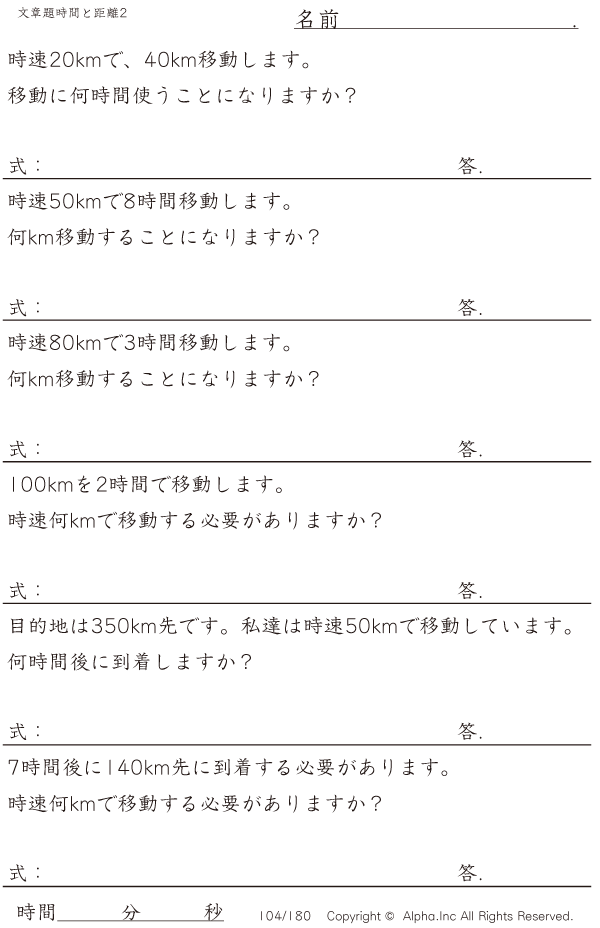 上記のボタンから「時間と距離の文章題2:時速80kmまで・10km単位」の算数数学ドリル・計算ドリル(PDFプリント)がダウンロードできます。個人利用は無料です(家庭以外での配布は有料です)。