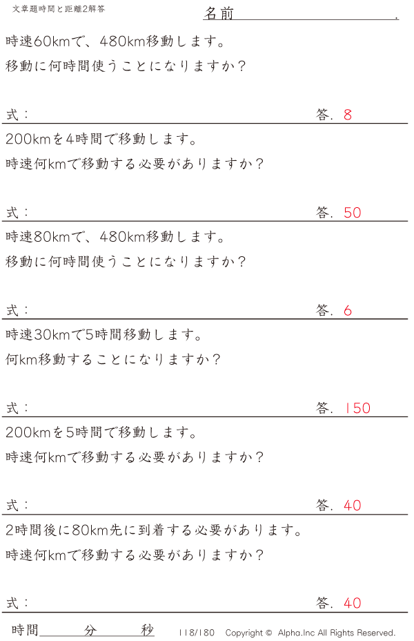 時間と距離の文章題2:時速80kmまで・10km単位 [解答]118/180