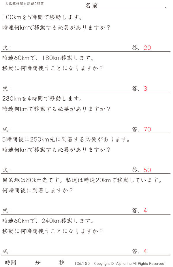 時間と距離の文章題2:時速80kmまで・10km単位 [解答]126/180