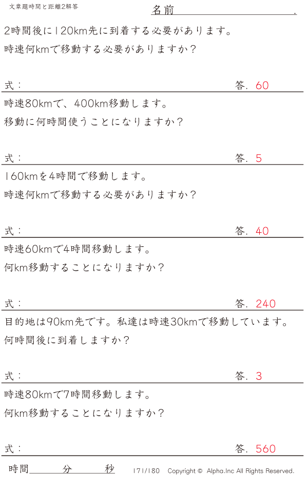 時間と距離の文章題2:時速80kmまで・10km単位 [解答]171/180