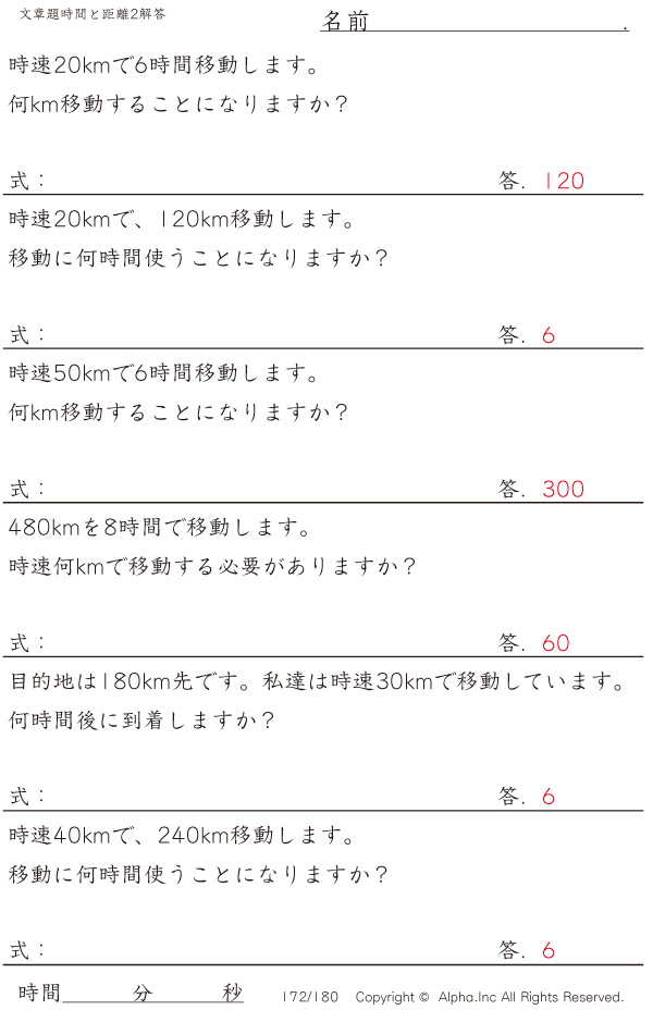 時間と距離の文章題2:時速80kmまで・10km単位 [解答]172/180