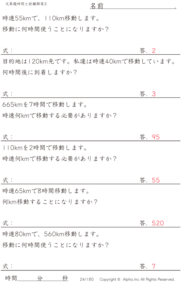時間と距離の文章題3:時速120kmまで・5km単位 [解答]024/180