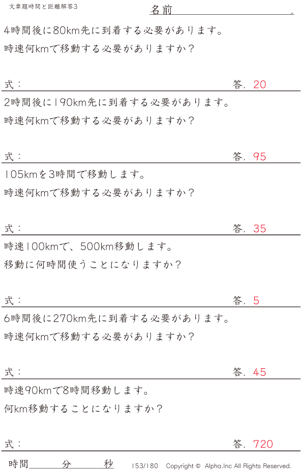 時間と距離の文章題3:時速120kmまで・5km単位 [解答]153/180