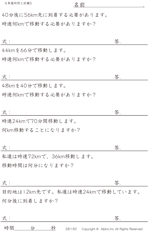 上記のボタンから「時間と距離の文章題5:分単位・120分・120kmまで」の算数数学ドリル・計算ドリル(PDFプリント)がダウンロードできます。個人利用は無料です(家庭以外での配布は有料です)。