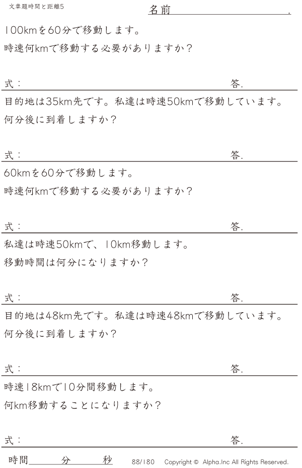 時間と距離の文章題5:分単位・120分・120kmまで [問題]088/180