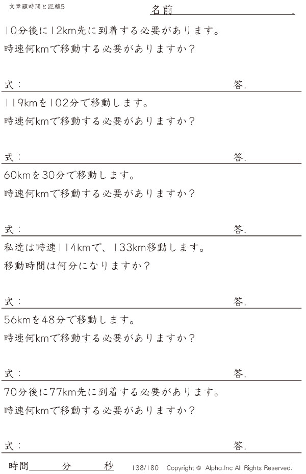 時間と距離の文章題5:分単位・120分・120kmまで [問題]138/180