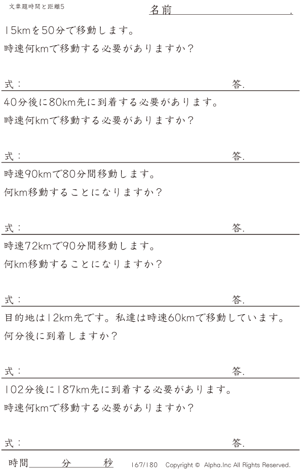 時間と距離の文章題5:分単位・120分・120kmまで [問題]167/180