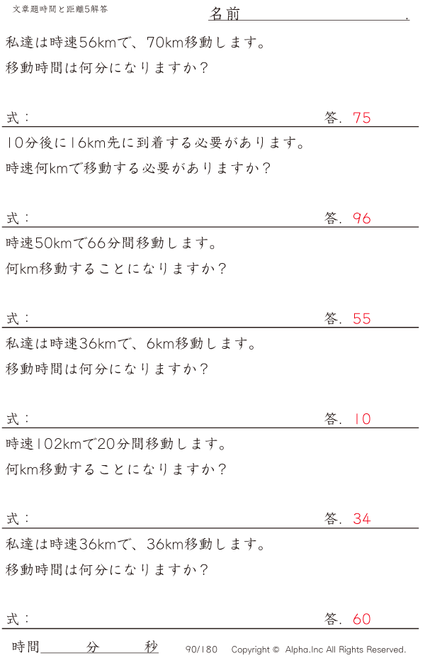 時間と距離の文章題5:分単位・120分・120kmまで [解答]090/180