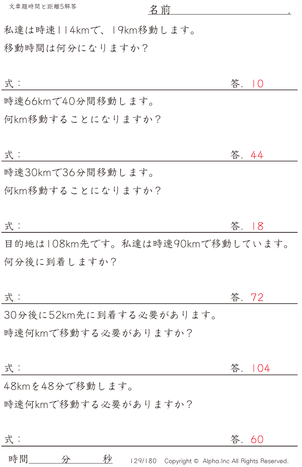 時間と距離の文章題5:分単位・120分・120kmまで [解答]129/180