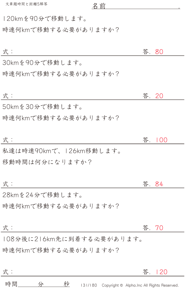 時間と距離の文章題5:分単位・120分・120kmまで [解答]131/180