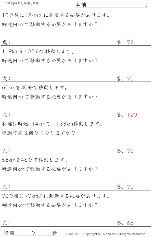 時間と距離の文章題5:分単位・120分・120kmまで [解答]138/180
