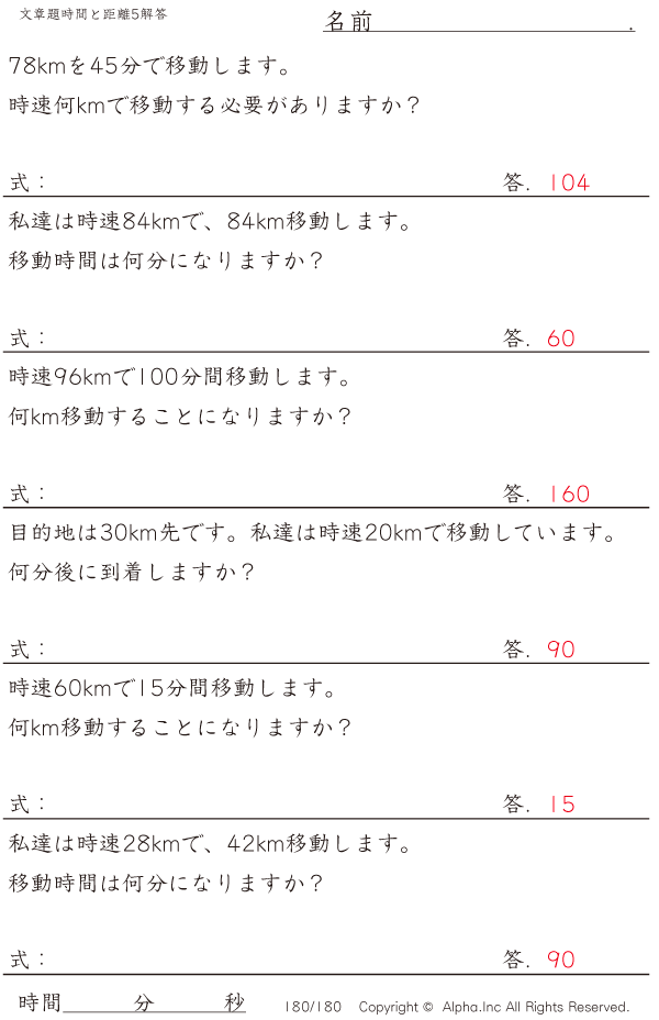 時間と距離の文章題5:分単位・120分・120kmまで [解答]180/180