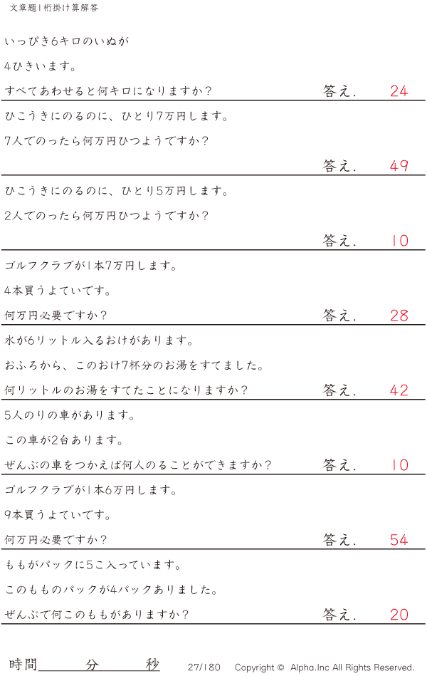 上記のボタンから「1桁の掛け算の文章題」の算数数学ドリル・計算ドリル(PDFプリント)がダウンロードできます。個人利用は無料です(家庭以外での配布は有料です)。