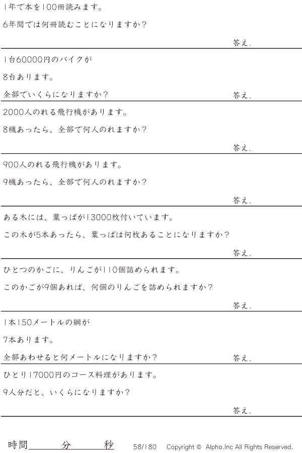 上記のボタンから「大きい数値の掛け算文章題2」の算数数学ドリル・計算ドリル(PDFプリント)がダウンロードできます。個人利用は無料です(家庭以外での配布は有料です)。