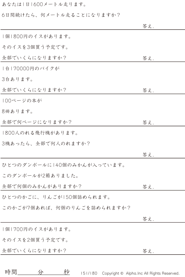 上記のボタンから「大きい数値の掛け算文章題2」の算数数学ドリル・計算ドリル(PDFプリント)がダウンロードできます。個人利用は無料です(家庭以外での配布は有料です)。