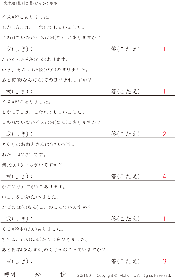 1桁の引き算の文章題(ふりがなつき) [解答]023/180