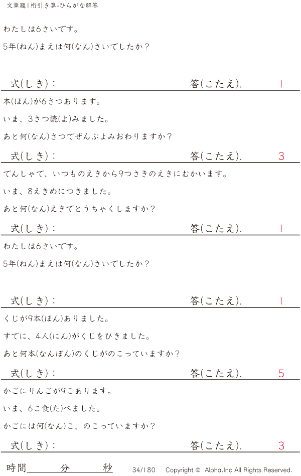 1桁の引き算の文章題(ふりがなつき) [解答]034/180