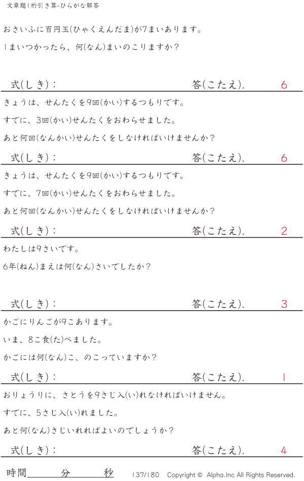 1桁の引き算の文章題(ふりがなつき) [解答]137/180