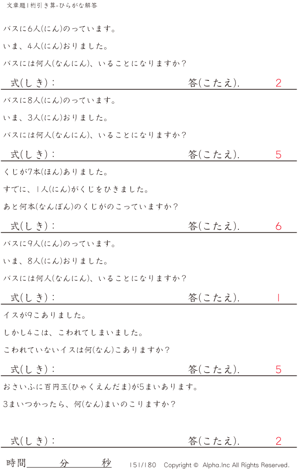 1桁の引き算の文章題(ふりがなつき) [解答]151/180