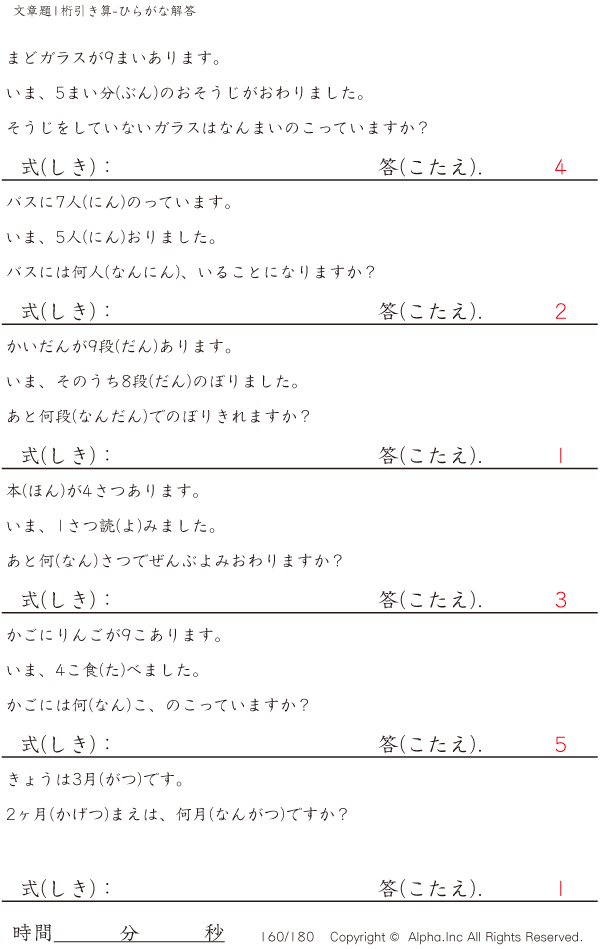 1桁の引き算の文章題(ふりがなつき) [解答]160/180