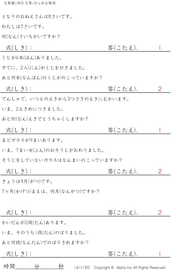 1桁の引き算の文章題(ふりがなつき) [解答]161/180