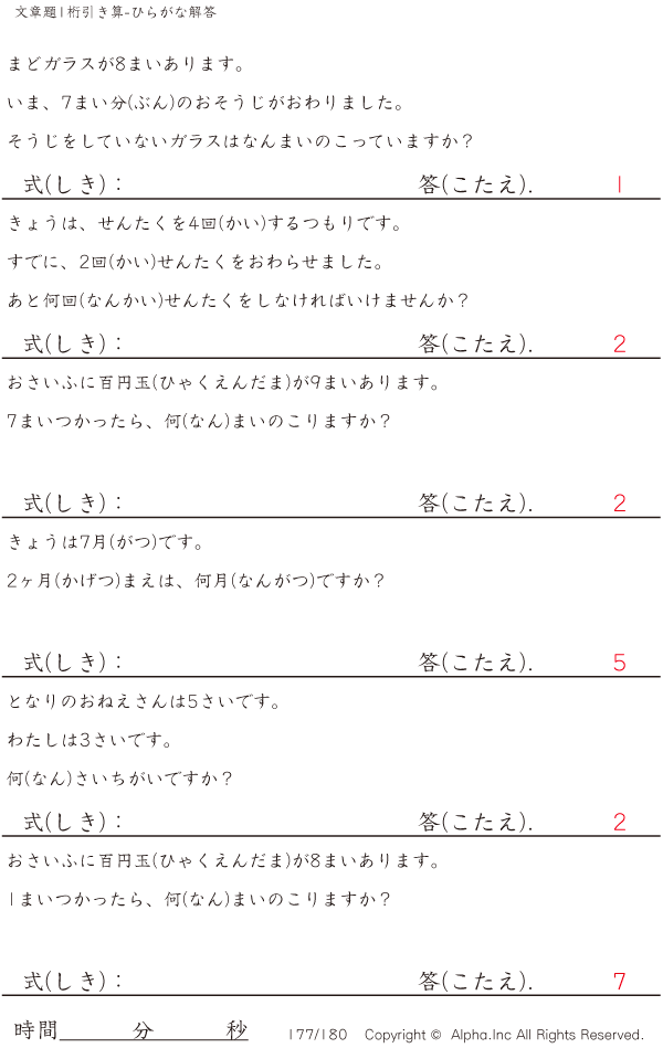 1桁の引き算の文章題(ふりがなつき) [解答]177/180