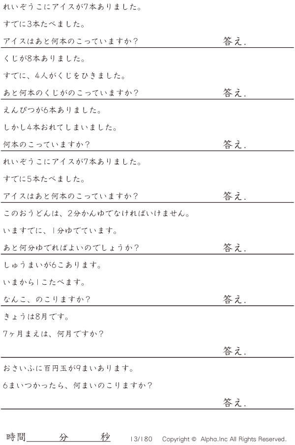 上記のボタンから「1桁の引き算の文章題-1」の算数数学ドリル・計算ドリル(PDFプリント)がダウンロードできます。個人利用は無料です(家庭以外での配布は有料です)。