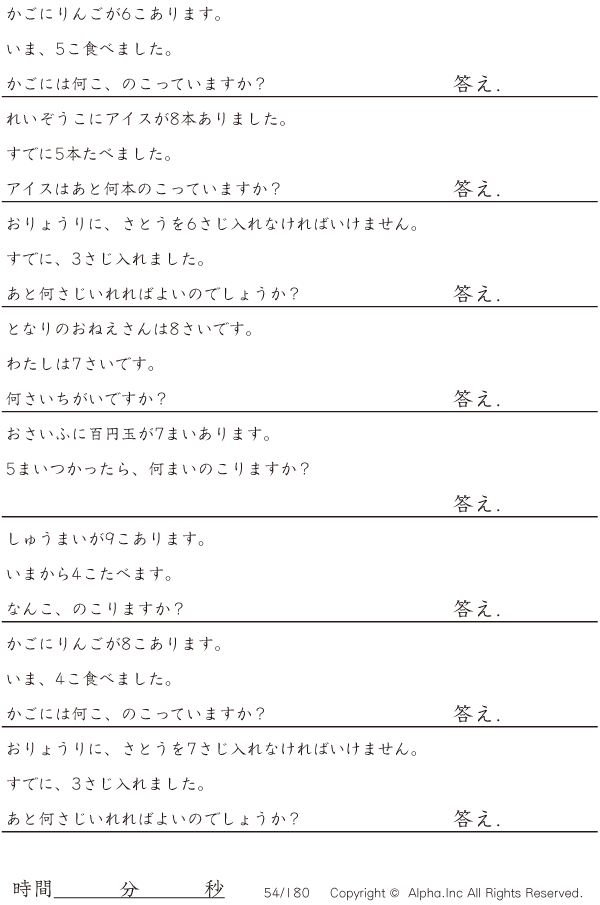 上記のボタンから「1桁の引き算の文章題-1」の算数数学ドリル・計算ドリル(PDFプリント)がダウンロードできます。個人利用は無料です(家庭以外での配布は有料です)。