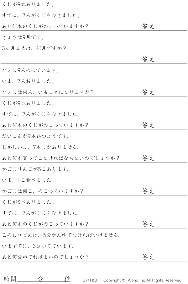 上記のボタンから「1桁の引き算の文章題-1」の算数数学ドリル・計算ドリル(PDFプリント)がダウンロードできます。個人利用は無料です(家庭以外での配布は有料です)。