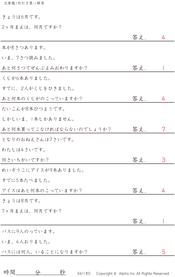 上記のボタンから「1桁の引き算の文章題-1」の算数数学ドリル・計算ドリル(PDFプリント)がダウンロードできます。個人利用は無料です(家庭以外での配布は有料です)。