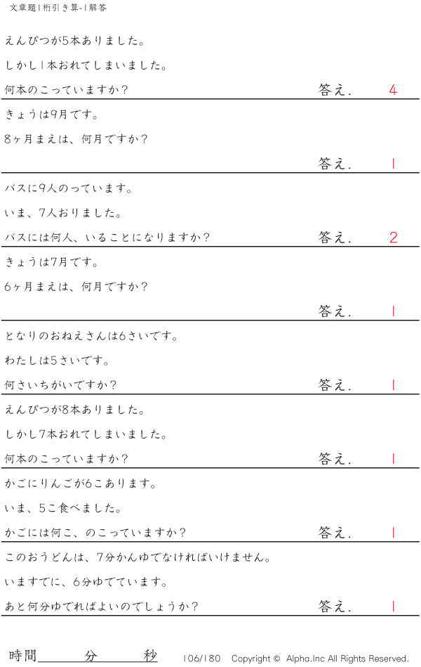 上記のボタンから「1桁の引き算の文章題-1」の算数数学ドリル・計算ドリル(PDFプリント)がダウンロードできます。個人利用は無料です(家庭以外での配布は有料です)。