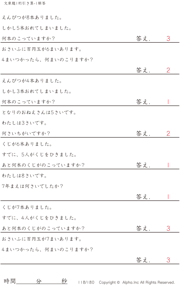 1桁の引き算の文章題-1 [解答]118/180