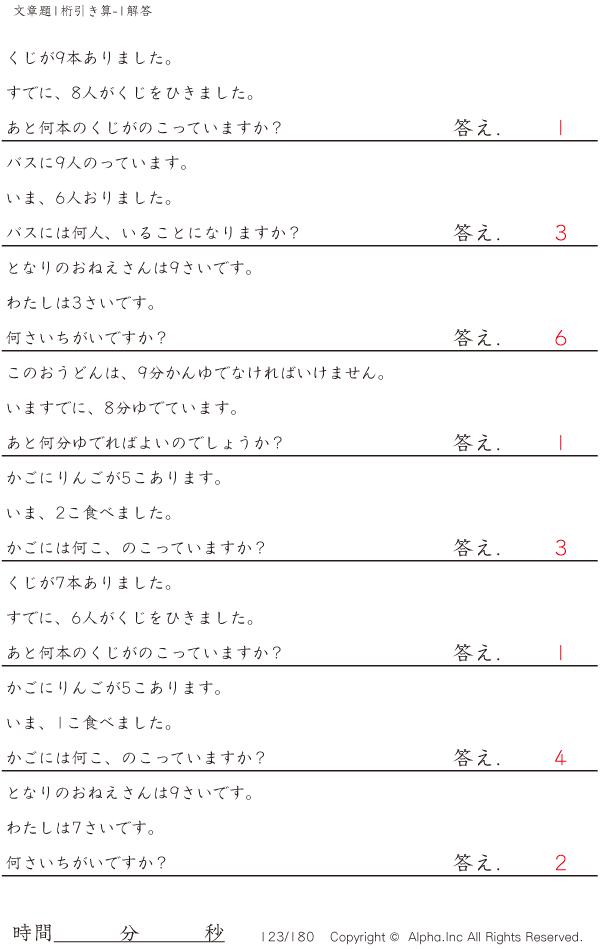 上記のボタンから「1桁の引き算の文章題-1」の算数数学ドリル・計算ドリル(PDFプリント)がダウンロードできます。個人利用は無料です(家庭以外での配布は有料です)。