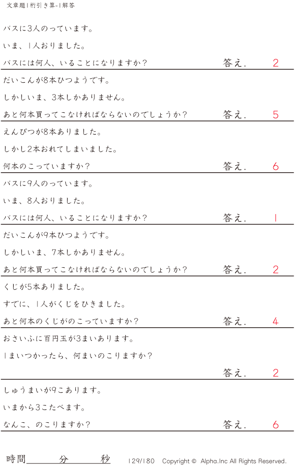 1桁の引き算の文章題-1 [解答]129/180