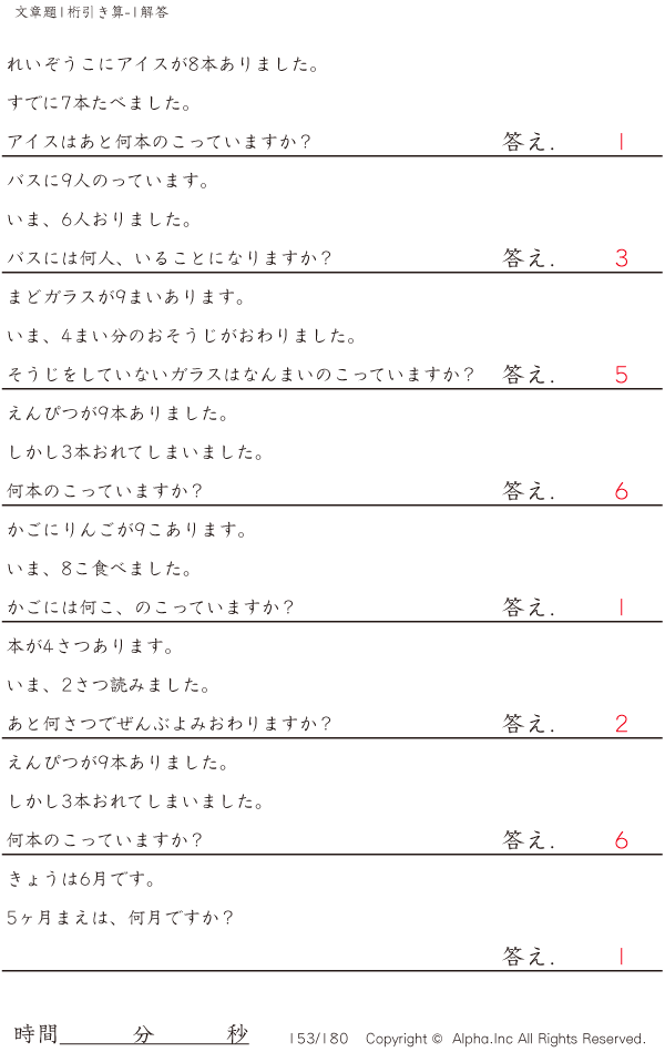上記のボタンから「1桁の引き算の文章題-1」の算数数学ドリル・計算ドリル(PDFプリント)がダウンロードできます。個人利用は無料です(家庭以外での配布は有料です)。