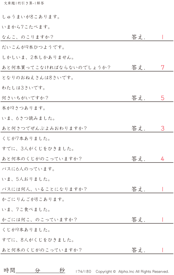 上記のボタンから「1桁の引き算の文章題-1」の算数数学ドリル・計算ドリル(PDFプリント)がダウンロードできます。個人利用は無料です(家庭以外での配布は有料です)。