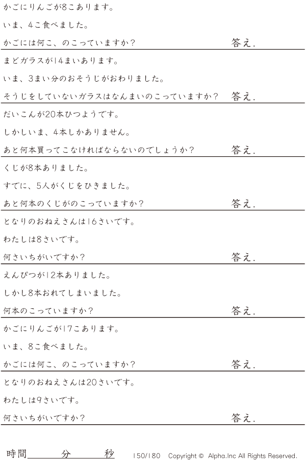 1桁の引き算の文章題-2-20まで [問題]150/180