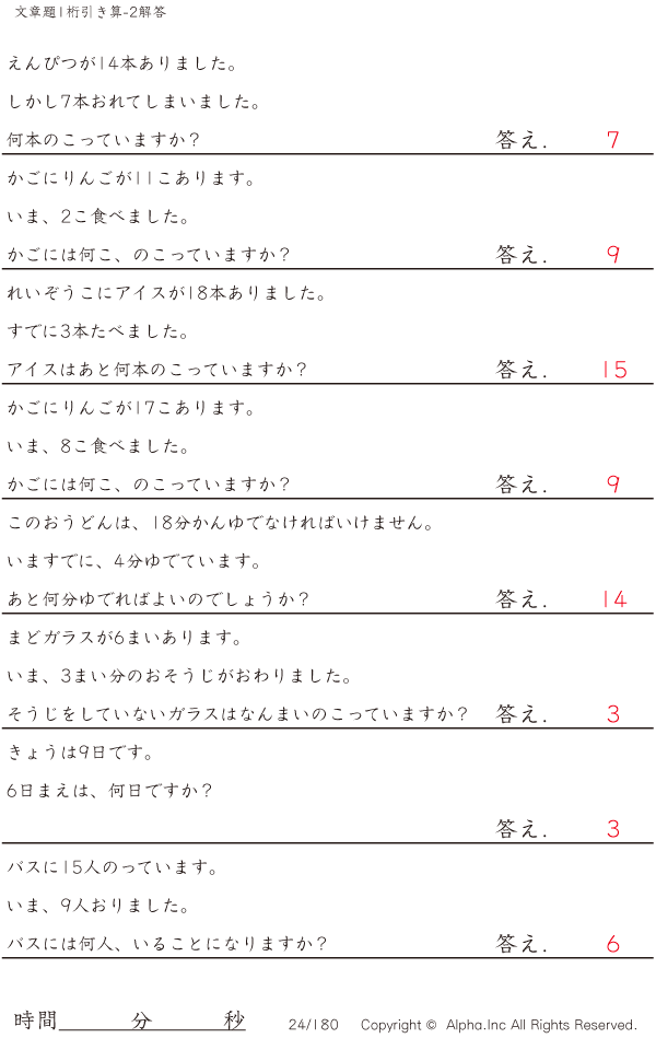 1桁の引き算の文章題-2-20まで [解答]024/180