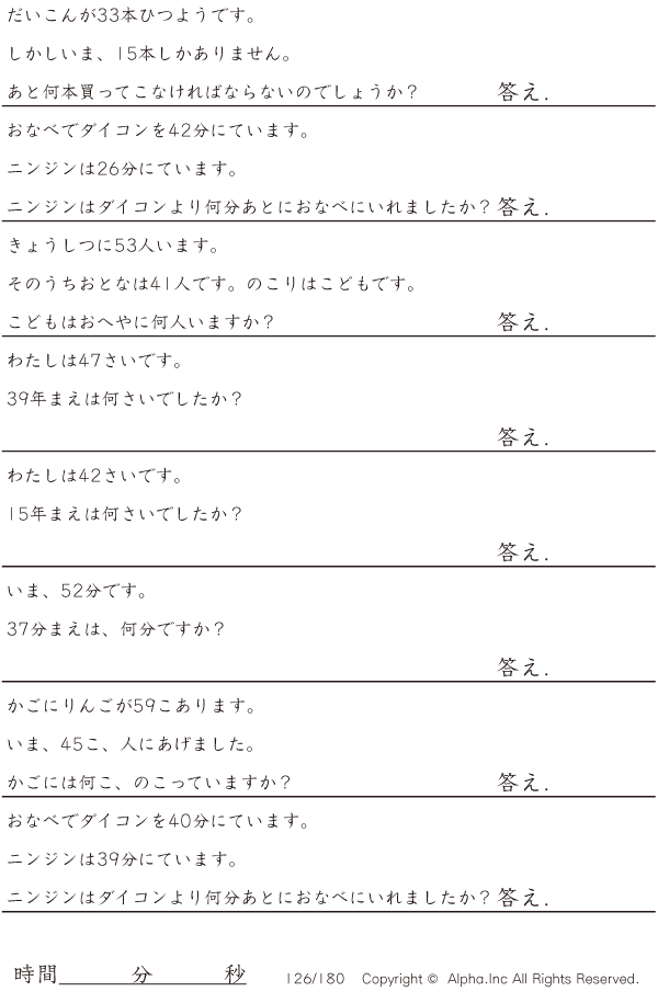 上記のボタンから「2桁の引き算の文章題」の算数数学ドリル・計算ドリル(PDFプリント)がダウンロードできます。個人利用は無料です(家庭以外での配布は有料です)。