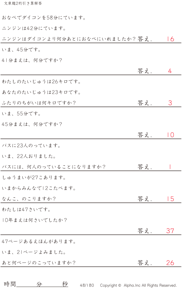 上記のボタンから「2桁の引き算の文章題」の算数数学ドリル・計算ドリル(PDFプリント)がダウンロードできます。個人利用は無料です(家庭以外での配布は有料です)。