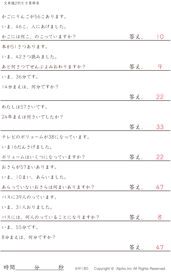 上記のボタンから「2桁の引き算の文章題」の算数数学ドリル・計算ドリル(PDFプリント)がダウンロードできます。個人利用は無料です(家庭以外での配布は有料です)。