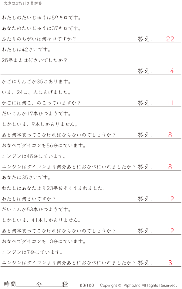 上記のボタンから「2桁の引き算の文章題」の算数数学ドリル・計算ドリル(PDFプリント)がダウンロードできます。個人利用は無料です(家庭以外での配布は有料です)。