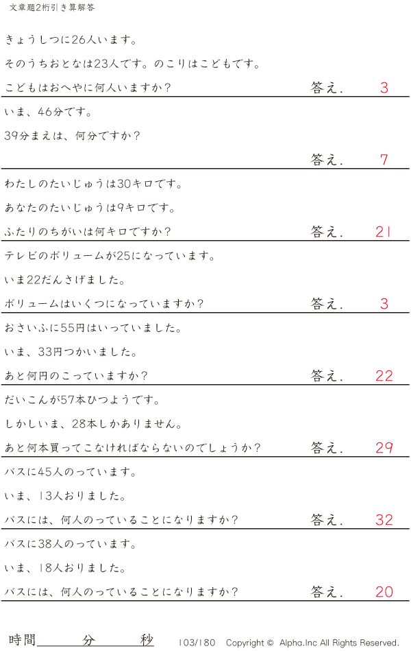 上記のボタンから「2桁の引き算の文章題」の算数数学ドリル・計算ドリル(PDFプリント)がダウンロードできます。個人利用は無料です(家庭以外での配布は有料です)。