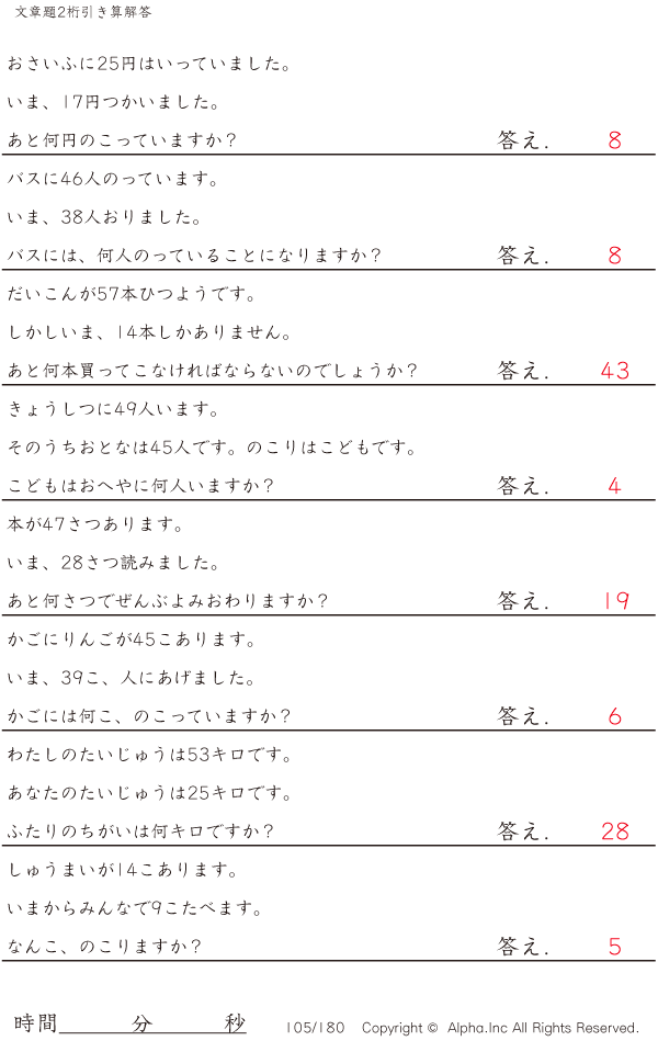 上記のボタンから「2桁の引き算の文章題」の算数数学ドリル・計算ドリル(PDFプリント)がダウンロードできます。個人利用は無料です(家庭以外での配布は有料です)。