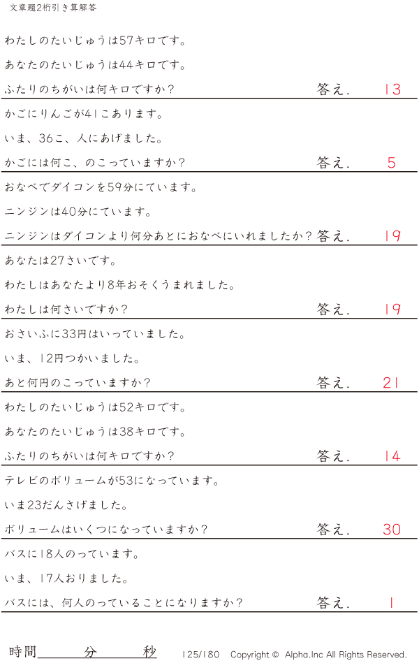 上記のボタンから「2桁の引き算の文章題」の算数数学ドリル・計算ドリル(PDFプリント)がダウンロードできます。個人利用は無料です(家庭以外での配布は有料です)。