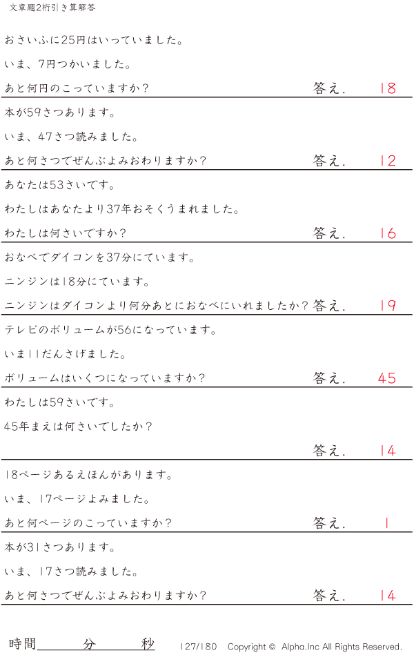 上記のボタンから「2桁の引き算の文章題」の算数数学ドリル・計算ドリル(PDFプリント)がダウンロードできます。個人利用は無料です(家庭以外での配布は有料です)。